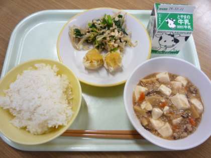 本日の献立は、ごはん、牛乳、にんじんシューマイ、小松菜の大豆そぼろ和え、マーボー豆腐でした。