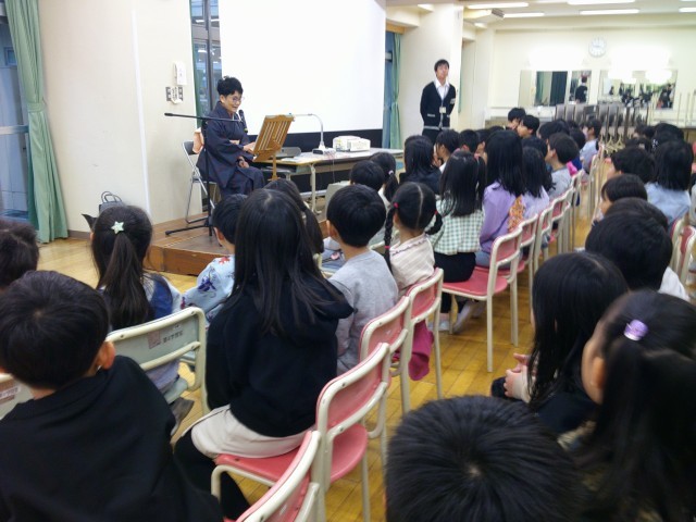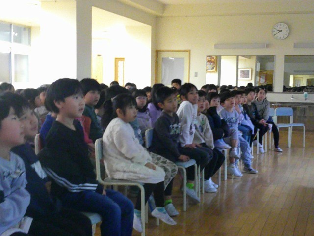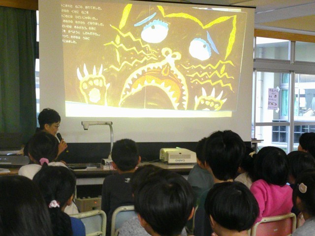 国語の学習で馴染みのある「たぬきの糸車」や、富山弁の「おおきなかぶ」等の朗読を聞きました。絵本「ねこざかな」の朗読では、物語をじっくり聞く姿が見られました。