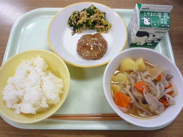 本日の献立は、ごはん、牛乳、鶏つくね、納豆和え、豚肉の南蛮煮でした。