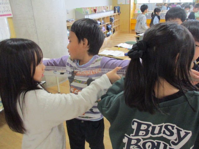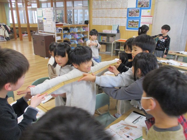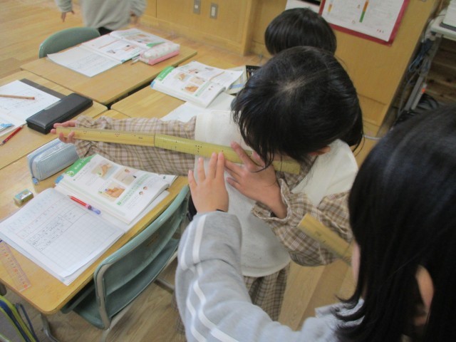 各教科の学習もがんばっています。長さの学習では、自分たちの体の部分の長さを測りながら、すでに聞きなじみのある単位「メートル」について知ったり、長いものの長さを測るときには1メートルものさしが便利だと実感したりしました。