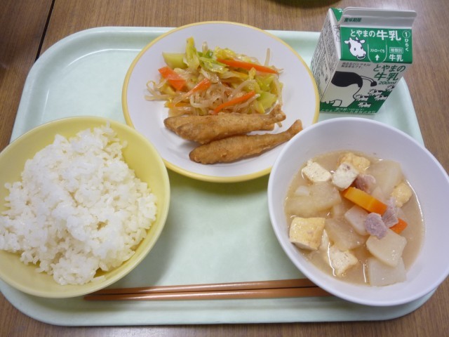 本日の献立は、ごはん、牛乳、わかさぎのフリッター、春雨サラダ、大根のみそ煮込みです。