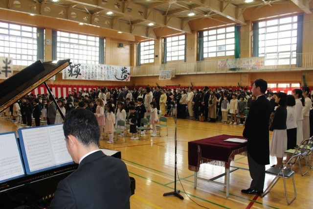 式には、在校生からは5年生と6年生が代表として出席しています。式の終わりには、校歌を力強く歌ってお手本を示し、1年生の子供たちもまた一緒に口ずさむことができました。