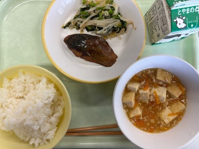 今日の献立は、ごはん、鰺のみりん焼き、しょうがひたし、厚揚げのそぼろ煮、牛乳です。