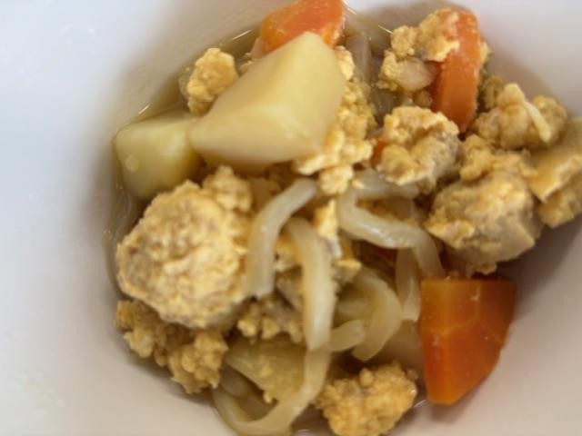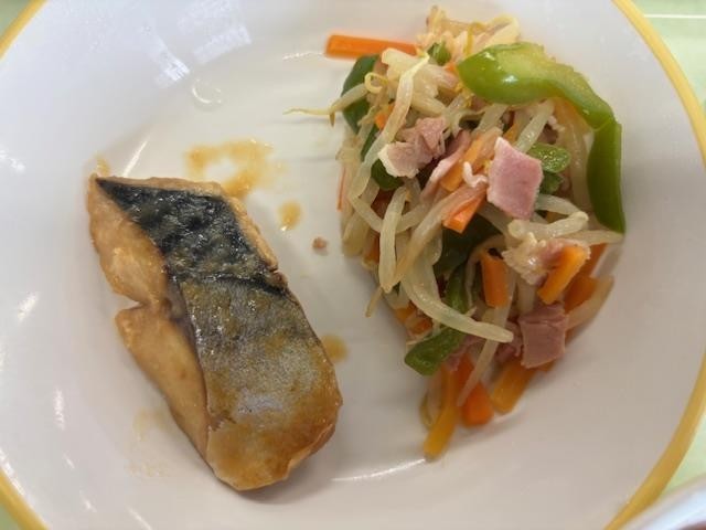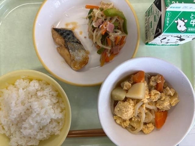今日の献立は、ごはん、さばのみそ煮、野菜ソテー、卵とじ、牛乳です。さばのみそ煮は、さばの切り身を味噌で煮込んであります。味の濃い味噌味が、ごはんによく合います。卵とじは、豚肉やこんにゃく、玉ねぎ、じゃがいもなどを卵でとじてあります。高野豆腐もは入っています。