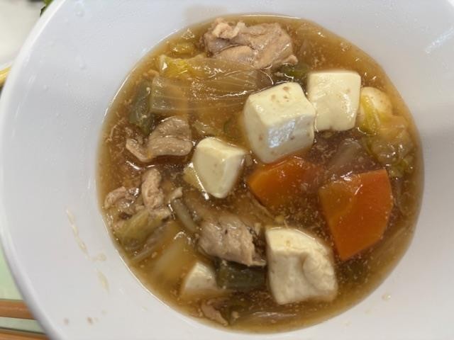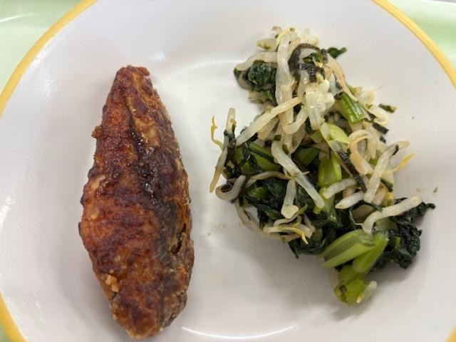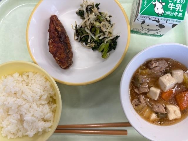 今日の献立は、ごはん、ふくらぎの竜田揚げ、磯あえ、豆腐と野菜のうま煮、牛乳です。