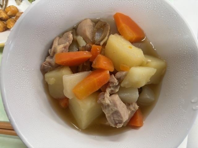 今日の献立は、ごはん、小魚入りフライビーンズ、よごし、南蛮煮、牛乳です。