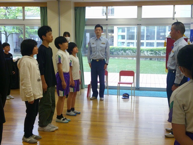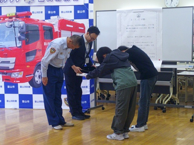 消防署の方からBFCバッジを受け取りました。火災予防のために、身近なところから進んで活動していきましょう。