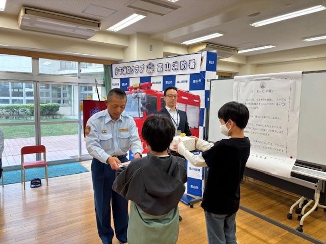 BFCバッジ授与式を行いました。富山消防署より消防士さんに来ていただき、BFCクラブ員としての証となるBFCバッジを授与していただきました。