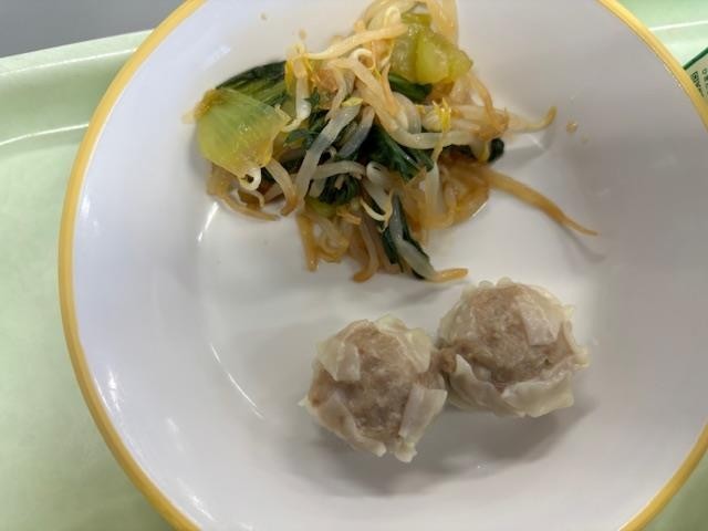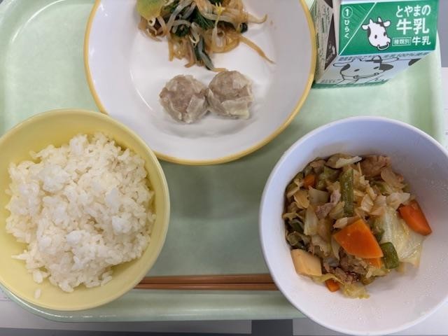 今日の献立は、ごはん、肉シュウマイ、香味あえ、回鍋肉、牛乳です。