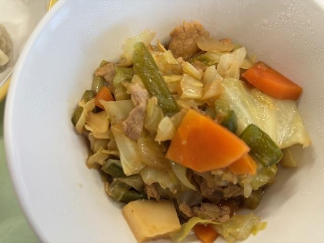 回鍋肉は、中華料理の代表格ですね。くわしくは四川料理で、回鍋とは、鍋を回すことではなく、一度調理した食材を再び鍋に戻して調理することの意味だそうです。今日の回鍋肉は、豚肉や玉ねぎ、にんじんやキャベツ、たけのこなど具だくさん、一味唐辛子が少し入ってピリッとしたおいしさがあります。