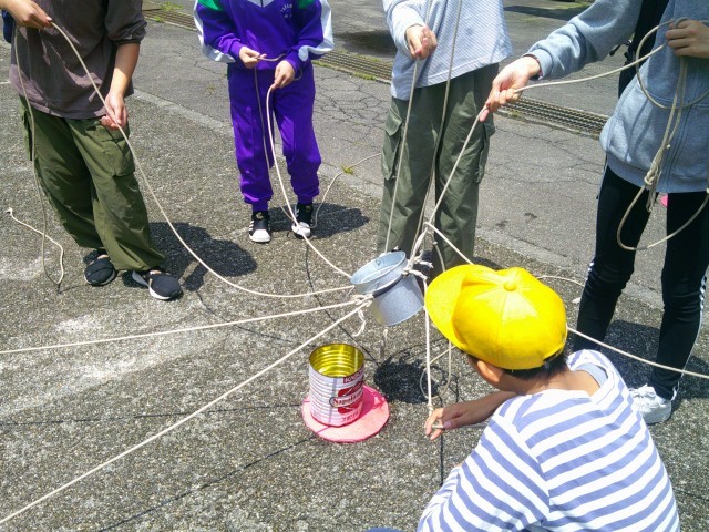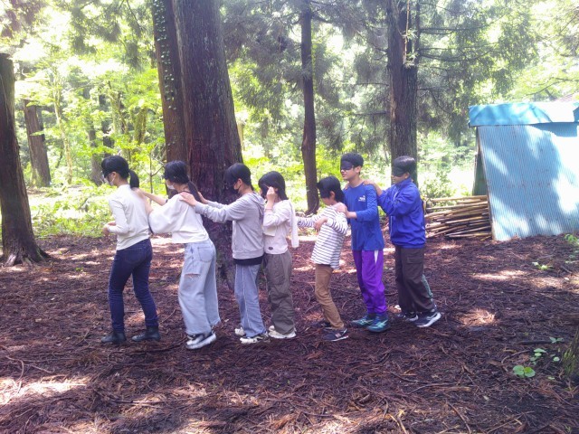 写真は森のエンカウンターの活動の様子です。アイマスクをして列になり歩いたり、息を合わせて水を缶に入れたりするゲームに挑戦しました。班と協力することが成功のヒントになります。応援したり声を掛け合ったりして活動を楽しみました。