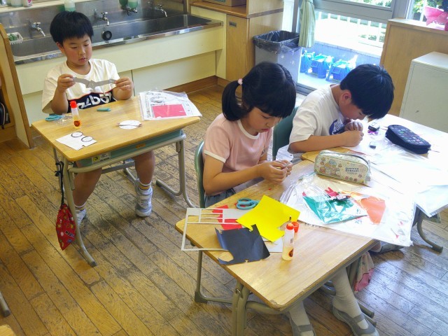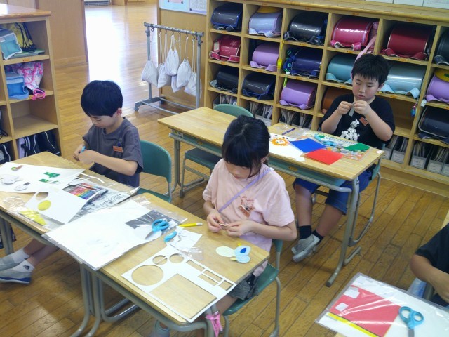 図画工作科の学習で、わりピンを使った作品を制作しています。重ねた紙にわりピンをさして、動きを生み出します。その動きをうまく生かした楽しい作品が、次々にでき上がっています。