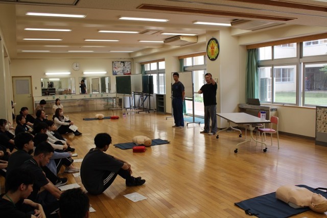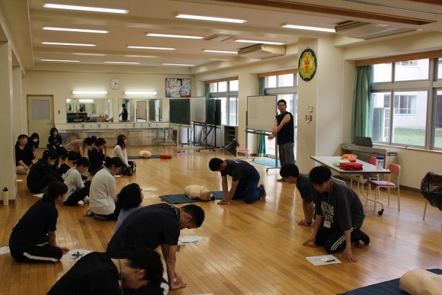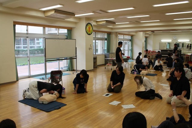富山消防署より講師をお招きして、救急法講習会を行いました。全教員の他、愛育会からの保護者の方々の参加も加えて、およそ90分間、心肺蘇生法や応急処置の方法について学びました。間もなく水泳指導が始まりますが、プールでの事故をはじめ、万が一の際冷静な対応ができるよう、技能の向上に努めています。