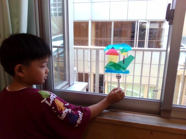 違う色のセロファンを重ねたり、光に透かせてどうなるか確かめたりしました。