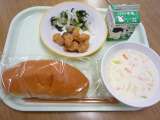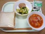 本日の献立は、食パン、牛乳、チキンハンバーグ、グリーンサラダ、野菜とソーセージの...
