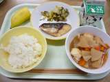 本日の給食は、ごはん、牛乳、鯖の塩焼き、チンゲンサイソテー、鶏肉と根菜の煮物、バ...