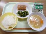 本日の給食は、ごはん、牛乳、揚げ出し豆腐の肉みそかけ、磯和え、みそ汁でした。