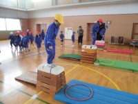 1年生がとび箱遊びをしています。跳び箱に手をしっかりと着き、跳び乗り、両足でフ...