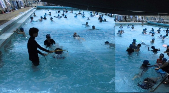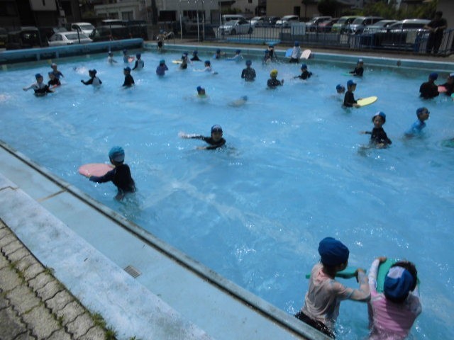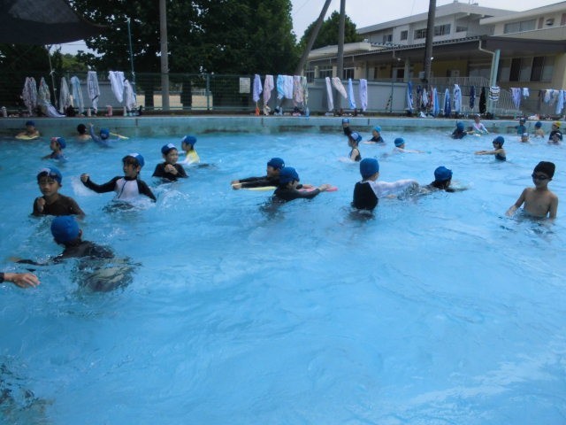 2年生が、「ぶくぶく、ぱっ」、くらげうき、だるまうき、けのび、ばた足、わくぐりなど、プールでできるようになったことを試しました。また、少しでも泳げるようになった子供、25m泳げる友達の泳ぎなどを見合い、最後に自由遊びもしました。