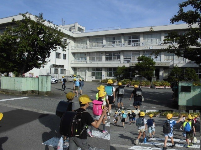 2学期がスタートしました。子供たちが、夏休みの宿題や作品、内履きズック、読んだ本などを持って登校してきました。まだまだ暑いので、必ず帽子をかぶり、水筒(多めの飲料水)を持ってきます。軽量ナップサックを推奨し、風のない日は日傘を差しても構いません。※学校前では、新しい地区センターの工事が本格化しており、その横を子供たちが通ってきます。