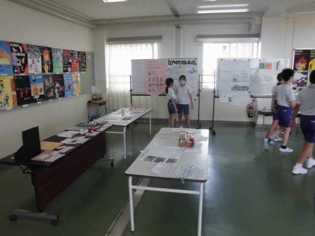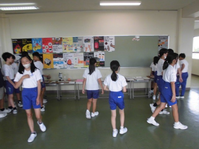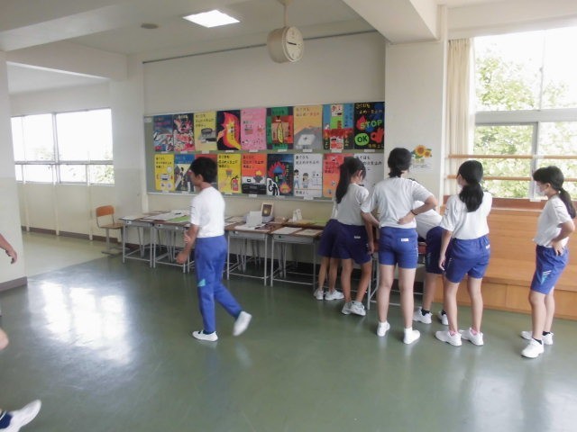 3階のくじらルームでは、6年生の夏休み作品が展示してあり、子供たちが見合っていました。防火ポスターや自由研究、工作など、小学校最後の夏休みに取り組んだ成果が集まっています。