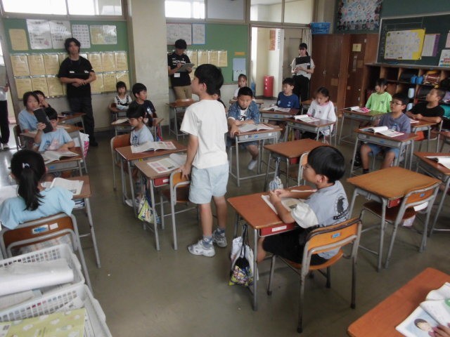 2年生道徳では、「さかなクン」の小学生の頃の話を読んで、ミーボ―の気持ちや自分のよさについて話し合っています。さかなクンの思いに共感しながら、じっくりと考えて発言したり、友達の意見も聴いたりできるようになりました。