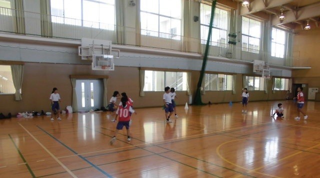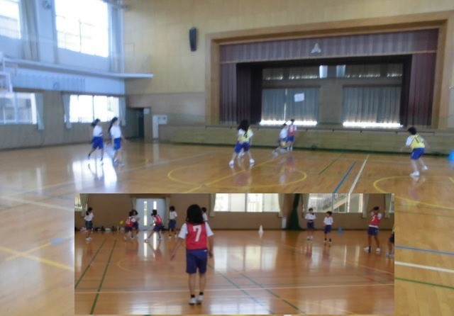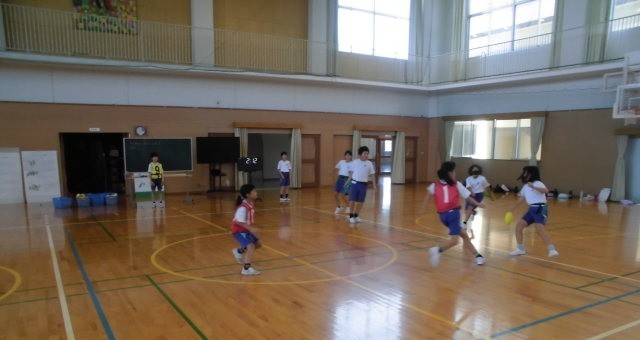 5年生が体育でタグラグビーをしています。腰にまいたタグ(しっぽ)をとる鬼ごっこをしながら、敏捷性や細かいステップを身に付け、チームの作戦や空間認識能力を高めています。