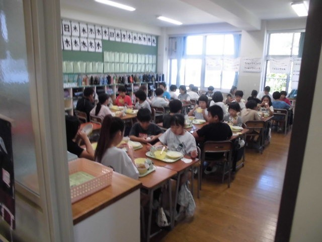 今日の献立は「ハヤシライス、ごはん、ビーンズサラダ、ゆで卵」でした。画像は、仲良くおいしく食べる3年生、協力して準備する2年生の様子。今日で今年度前半9月が終わり、明日から10月です。