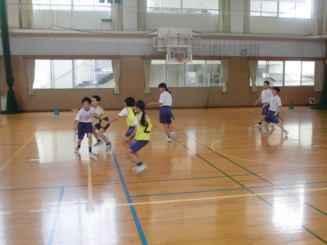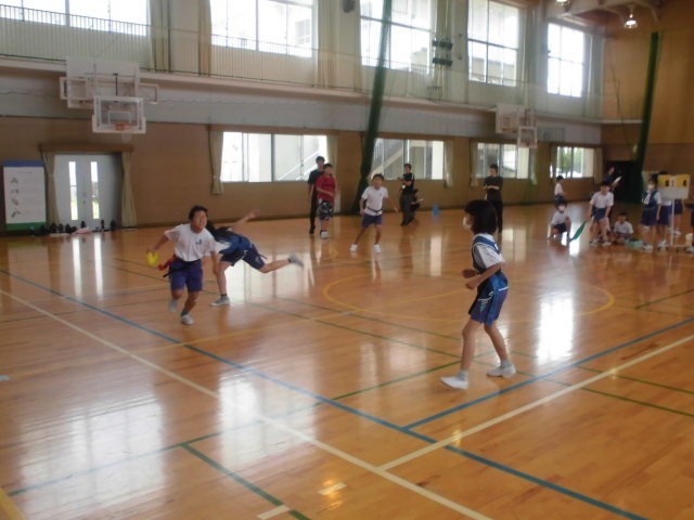 5年生が体育「タグラグビー」の学習を続けています。自分やチームで、目当てや作戦を立ててゲームに取り組み、時にはクラスみんなでルールについて話し合っています。身のこなし、相手のかわし方、パス、攻め方や守り方などに工夫や上達がみられます。