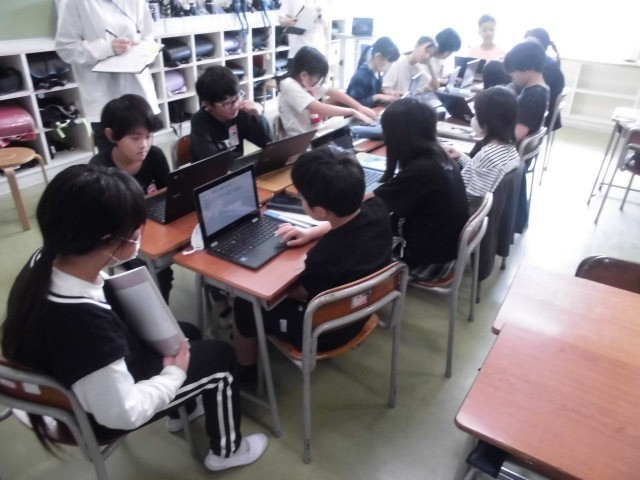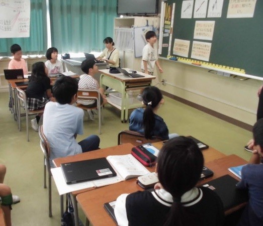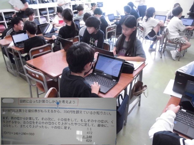 4年生が算数「およその数の表し方」の学習で、目的に合った計算の仕方を考えています。「わたしは代金がだいたいいくらか知りたい」「1000円で足りるか調べたい」クロムブックで考えをまとめたり、グループで教え合ったりしています。