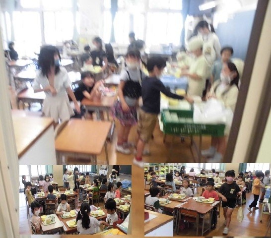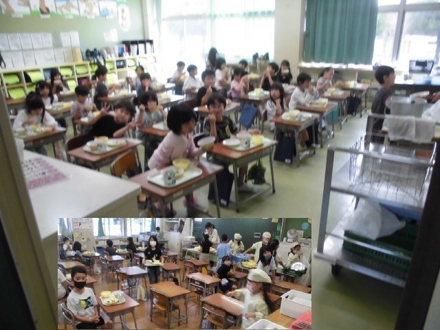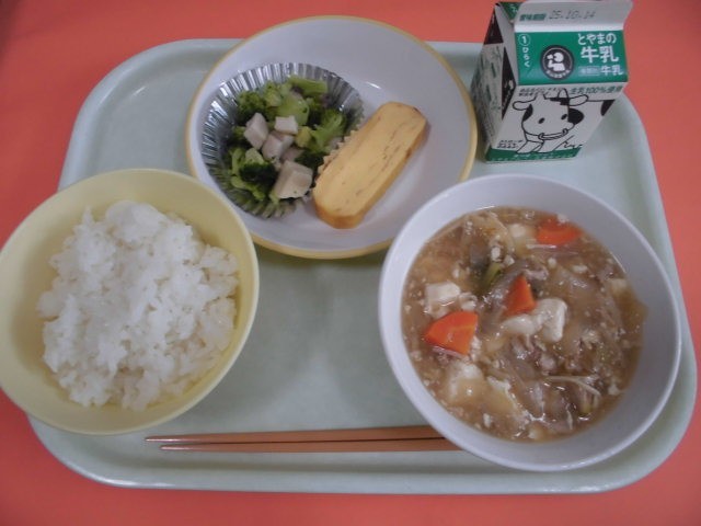 今日の献立は、「ごはん、厚焼き玉子、ブロッコリーとエリンギのソテー、豆腐の野菜あんかけ」でした。画像は、おいしく食べる1年生の様子です。