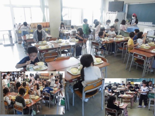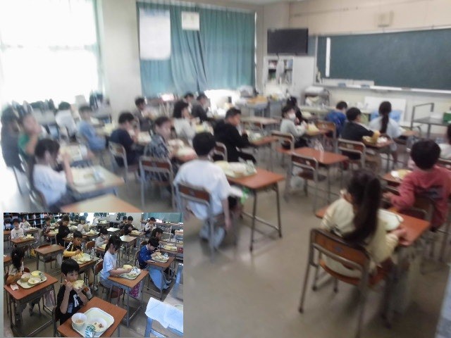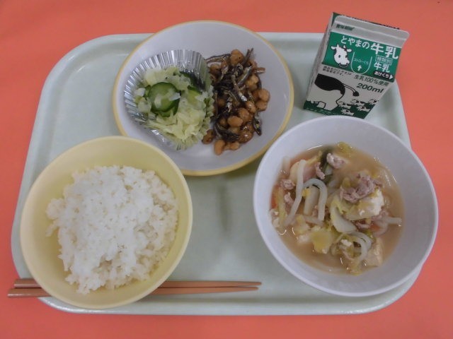「ごはん、小魚入りフライビーンズ、きざみあえ、白菜なべ」でした。画像は、静かに食べる2年生の様子です。