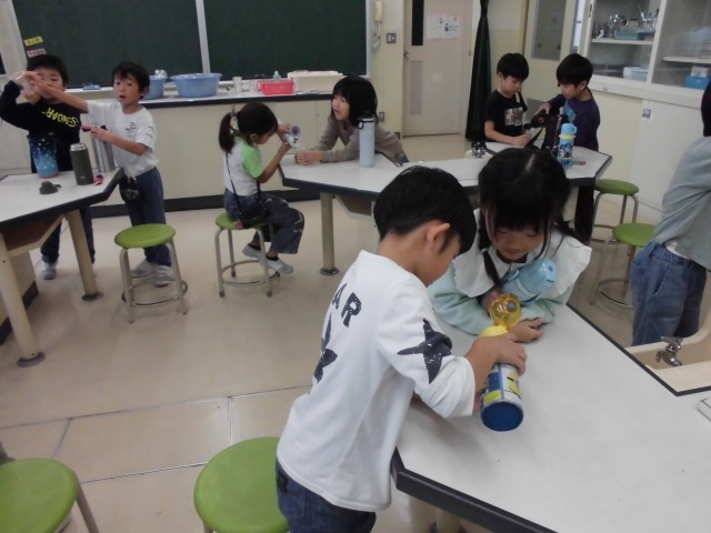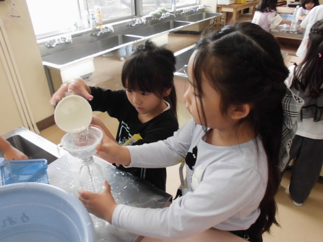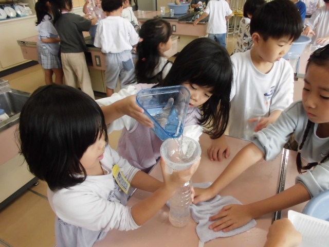 実際にペットボトル等、身の回りにある入れ物に水を入れ、どちらが多いか予想を立てた後、いろいろな方法で比べました。少ないと思っていた方の水をもう片方に移すとあふれてしまい、「あー!こっちが多かった!」と歓声を上げていた子供たちです。また、自分の水筒に水を入れて同じコップ何杯分かを比べて、どの水筒が一番多いかも調べました。楽しく学習の締めくくりをしました。