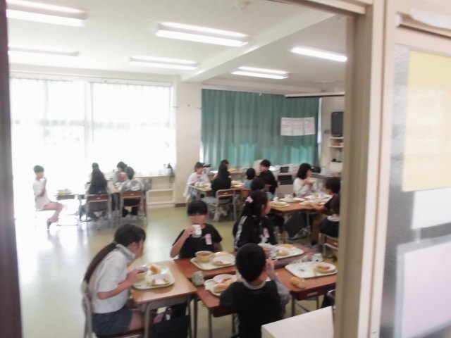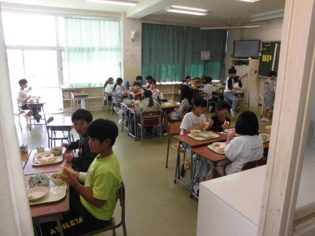 今日の給食は「コッペパン、焼きそば、あらびきウインナー、大根サラダ、ポケットチーズ」でした。画像は、おいしそうに焼きそばなどをほおばる4年生の様子。