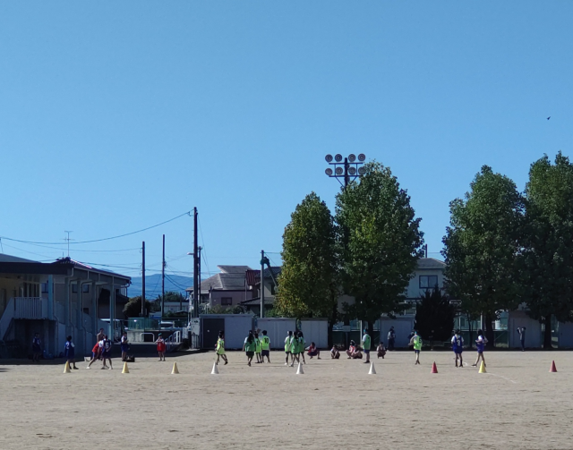秋晴れの気持ちのよいグラウンドで、4年生が体育でベースボールをしています。思い切り打ったり、走ったり、捕ったり投げたり、友達に声援をおくりながら、楽しく運動しています。明日は学習発表会です。