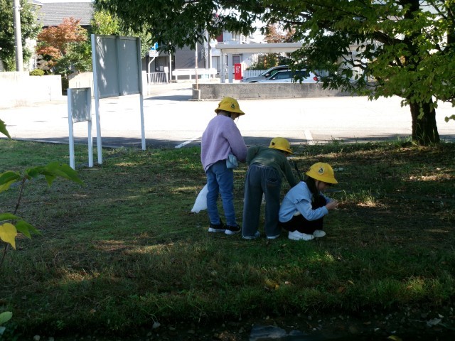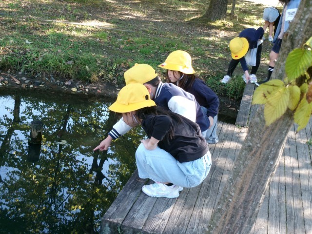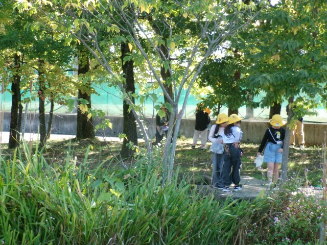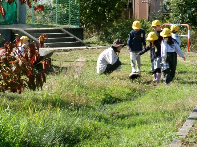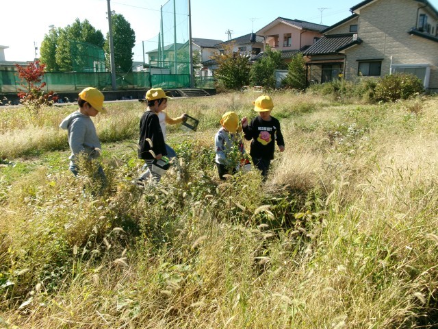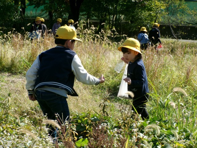 「あきをたのしもう」では、ビオトープで水辺の生き物を見つけたり、草むらで虫を探したりしました。あまり多くいなかったのですが、捕まえた虫をみんなで虫かごをのぞいて観察していました。また、たくさんのドングリや木の実を拾うことができました。この後、おもちゃづくりやリースづくりに使っていきたいと思います。