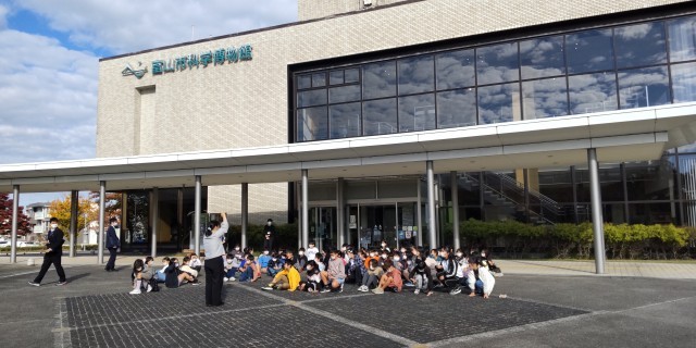 4年生が、市科学博物館見学に来ました。まずは、館の前で、方角の確認をしました。