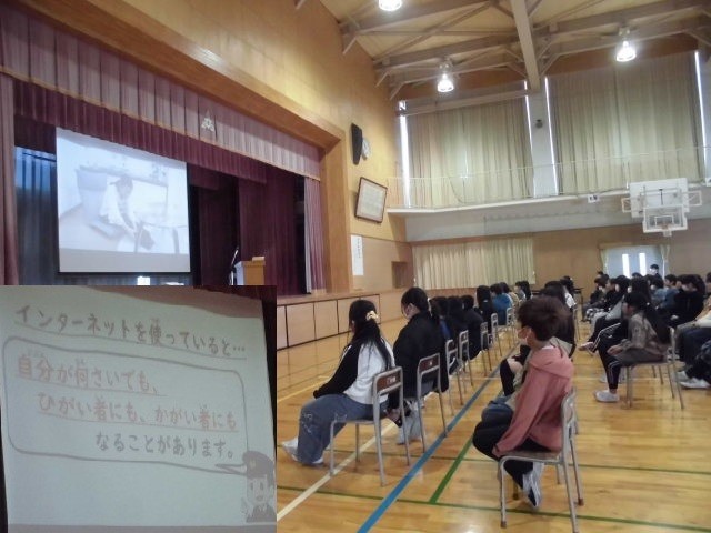 警察署少年課の方を講師として、学校保健委員会を行いました。「知らなかったではすまされない ~SNSの危険~」というテーマで、インターネットやSNSでの誹謗中傷、いじめ、詐欺、薬物、闇バイト、自画撮り画像の危険など、実際に市内10代の若者であった事例、起こり得るかもしれない内容について教えていただきました。今後も学校では「自分や友達がされて嫌なことはしない」「いじめは犯罪」「嫌なこと、心配なことがあれば先生や家の人、警察に相談する」などを指導していきます。また「メディアひとやすみ月間」を実施しています。