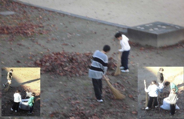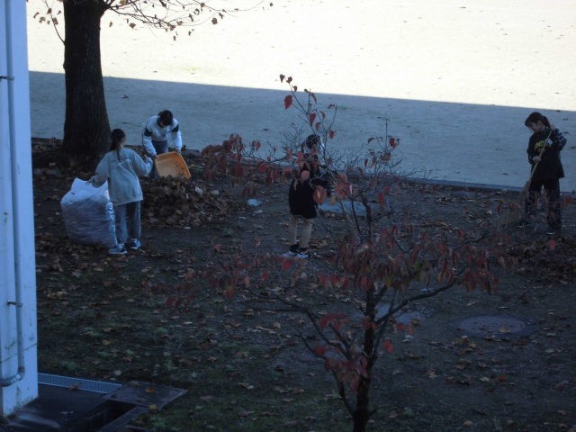 2学期最後の委員会活動。ボランティア委員会では、校庭の落ち葉はきに取り組み、楽しそうにがんばって、何袋も大きな多くの落ち葉を集めていました。