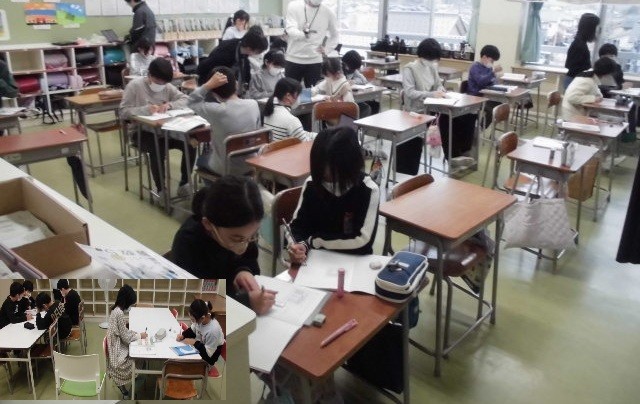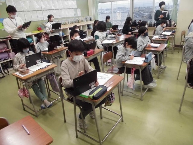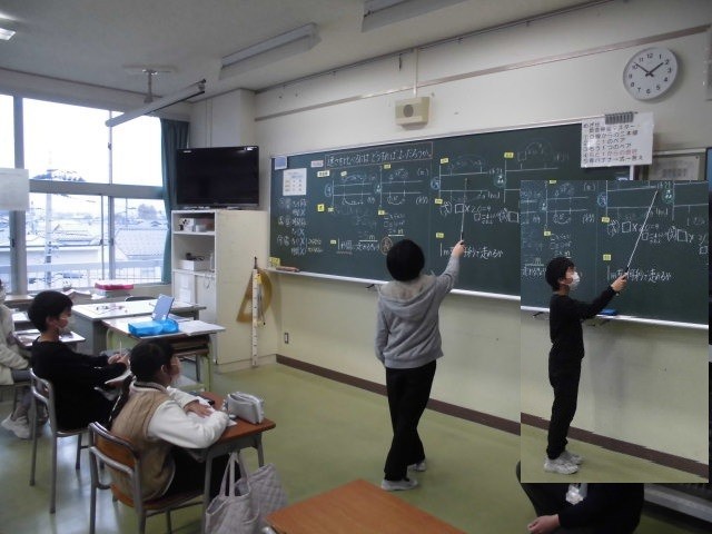 5年生算数で、速さの学習をしています。距離が異なる3人が走り、かかった時間から、だれが一番速いか確かめました。友達同士で、1秒間あたりに走った距離や、1mあたりにかかった時間を計算し、タブレットで振り返りをしました。日常生活や体育で生かしてほしいですね。