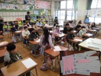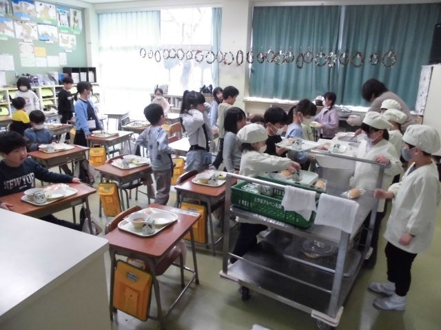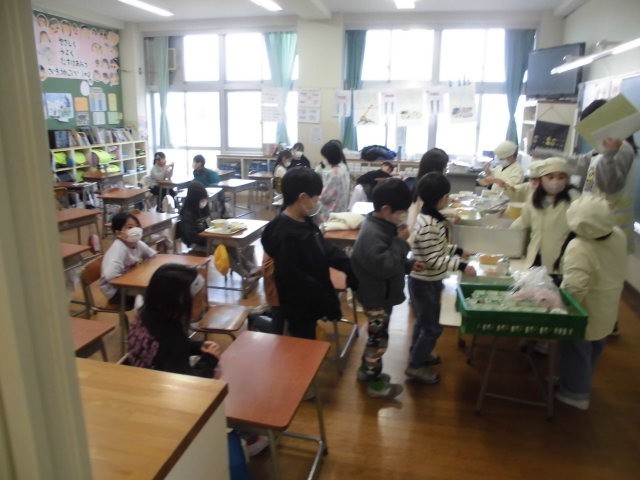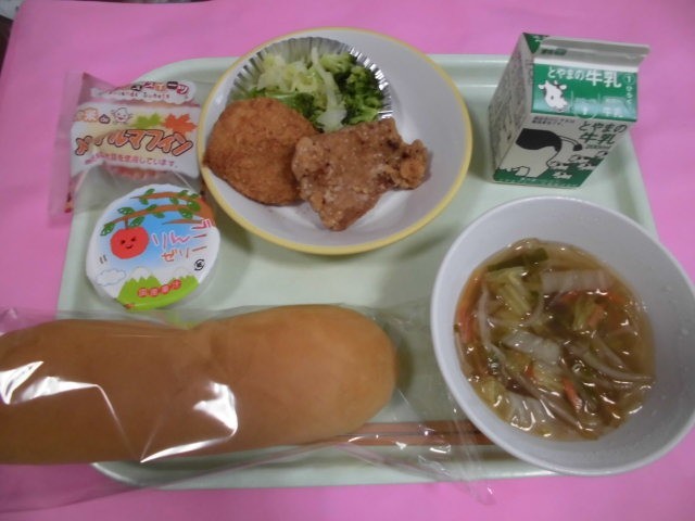 今日は、2学期最後の選択献立で、「コッペパン、豚肉の香り揚げ又はえびカツ、そえ野菜、りんごゼリー又はメープルマフィン」でした。画像は、あらかじめ希望したメニューを選んで準備する2年生の様子と、全部のせメニューの画像です。