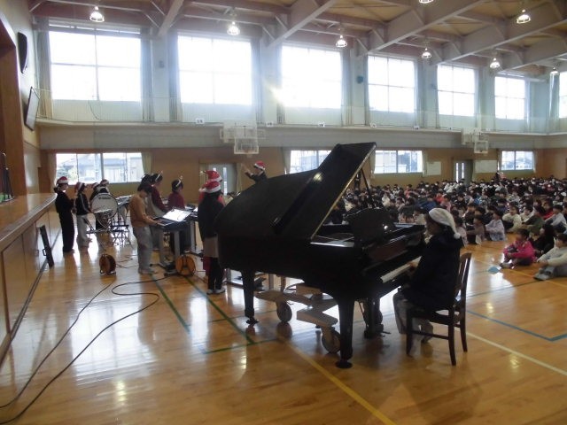 2学期終業式を体育館で行いました。まず初めに、音楽クラブの子供たちが練習してきた、冬やクリスマスの曲発表を聴きました。心が温かくなる楽しい演奏で、手や体を動かして聴く子供もいました。「メリークリスマス!」