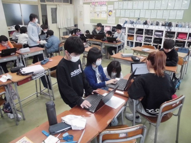 4年生が総合的な学習で、1・2学期調べてきた環境問題について、グループでまとめたり、学習参観で発表する原稿やクイズを考えたりしています。クロムブックを使ったり、ノートにメモしたりと、表現方法にも工夫がみられます。