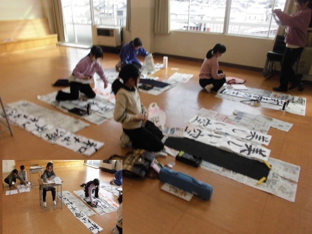 県小中書き初め大会に出場する、各学年の代表者が、校内で練習会をしています。校内書き初め大会より大きな紙に、大きな堂々とした文字で書いていました。今年度の県大会は、市体育館で集まって参加するのではなく、明日(23日)校内で大会を行い、出品します。
