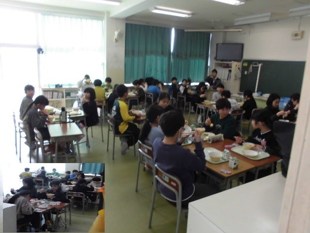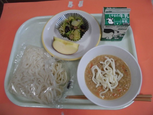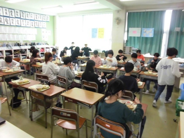 今日の献立は「肉みそソフトめん、ビーンズサラダ、りんご」でした。画像は、おいしく仲良く食べる4年生。来週は、学校給食週間です。