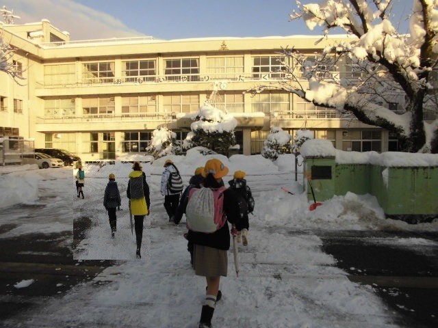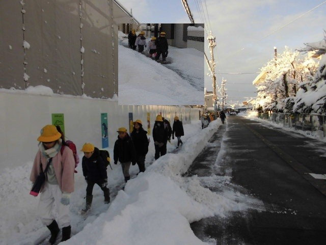 土日に積もった大雪の中、子供たちが登校してきました。スキーウェアのような防寒具を着て、手袋をつけ、長靴を履いてくるなど、暖かく安全な服装をしてきた子が多いです。★画像のように、学校で除雪もしましたが、道路や歩道いっぱいに雪が積もり、凍結もしているため、できる限り、学校への車での送迎や停車をお控えください。