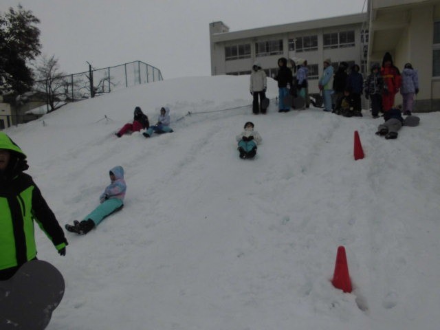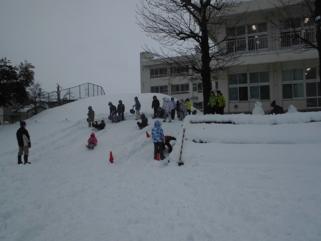 4年生も雪遊びをしました。クラスごとにローテーションをして、坂でそり滑り、リレー、バケツをめがけて雪投げなどに協力して取り組みました。