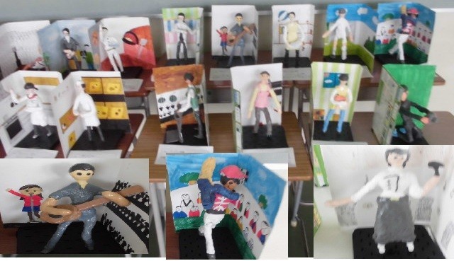 6年生は図画工作で、粘土細工作品を作りました。将来の夢、自分がなりたい、就きたい職業を想像し、服装や持ち物、動き等を思い浮かべながら仕上げました。3階クジラルームに展示してあります。学習参観でご覧ください。