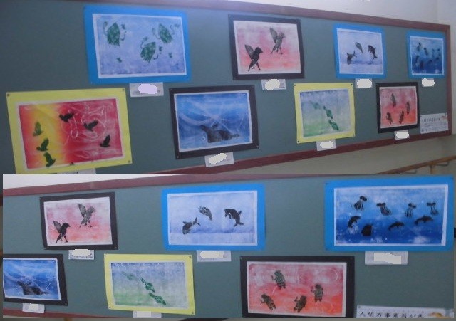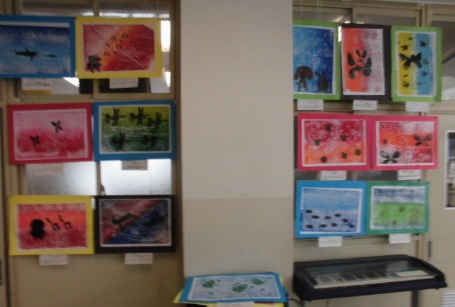 3年生の廊下には、図工版画作品が展示してあります。生き物などを黒で表し、その周りをけずったりひっかいたりした模様を付け、色を重ねたカラフルな作品が仕上がりました。