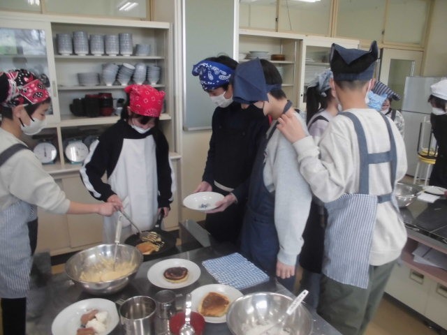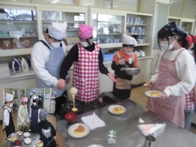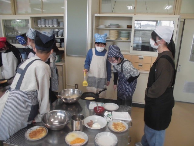 6年2組も、家庭科調理実習でパンケーキをつくりました。フライパンで生地を焼くと、少し焦がしてしまったグループもありましたが、ふっくらとおいしそうにできました。